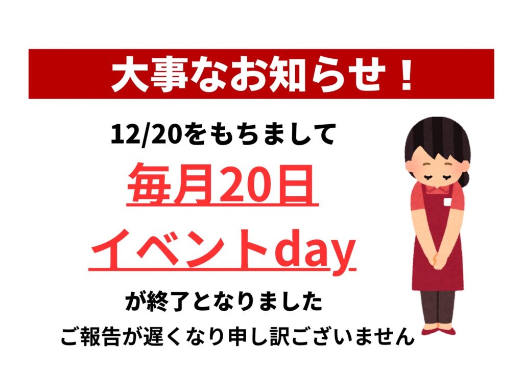 誠に残念ながら、毎月20日のイベント日は12/20をもちまして終了となりました。今後も何かしらのイベントを考えていますのでその際はまた投稿いたします!!